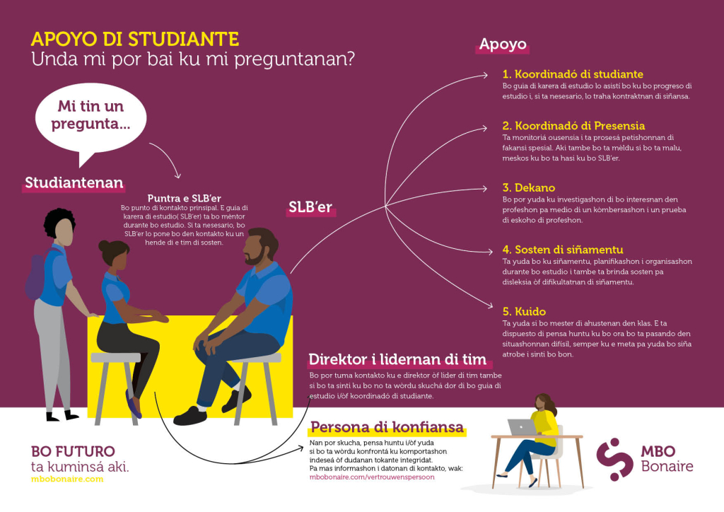 MBO Bonaire vindt het belangrijk dat iedereen zijn studie goed doorloopt. Het kan zijn dat je daar wat hulp bij nodig hebt. Daarom heeft MBO Bonaire een supportteam. Het supportteam bestaat uit mensen die je kunnen helpen op verschillende gebieden en altijd als doel dat je tot leren komt, je goed voelt en alle lessen kunt volgen van je opleiding en uiteindelijk je diploma kunt halen.