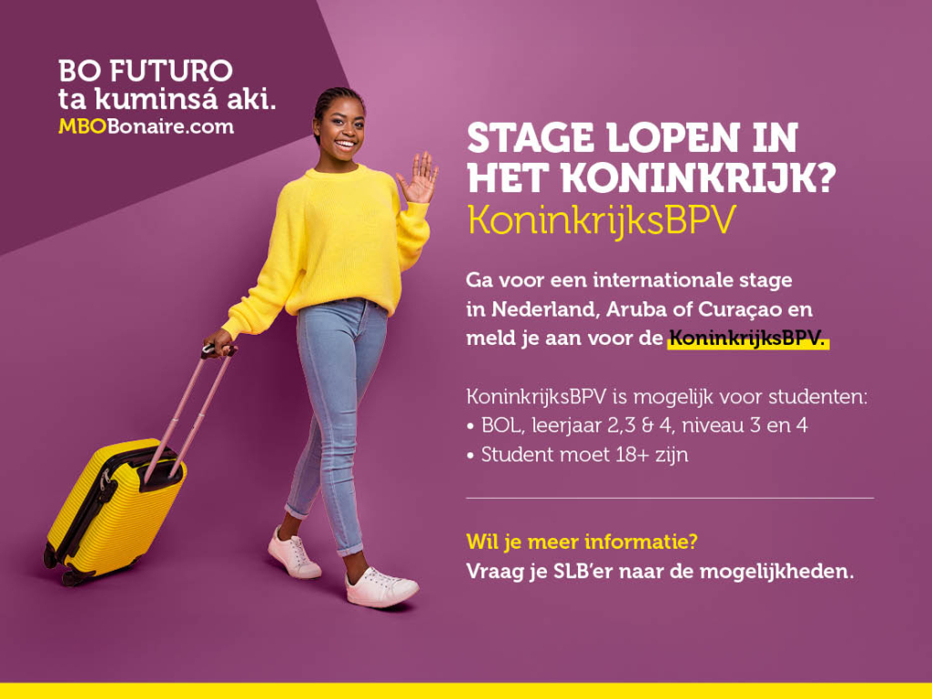Volg je een MBO opleiding op niveau 3 of niveau 4? Zit je in je voorlaatste of laatste jaar? En ben je 18 jaar of ouder? Dan kun je stage lopen in Nederland! Een stage in Nederland biedt jou de kans om de wereld buiten Bonaire te ontdekken.